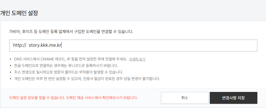 블로그 생성 직후 개인 도메인을 연결하려합니다. tistory 계정을 오늘 처음 만들어 볼 정도로 문외한이지만, 오류의 원인을 알려주지 않는 것을 보니 제대로 만든 플랫폼은 아닌 것 같습니다.그럼에도 재차 확인은 해야 하니 cloudflare에 접속했으나, 도메인은 정상적으로 등록돼있습니다. 변수를 찾아보니, Proxy status가 활성화 돼있습니다.생각해보니, 이걸 활성화 해두면 tistory가 제 DNS를 직접적으로 접속하진 못 할테죠.비활성화하고 재등록 해봅니다. 정상적으로 등록 됩니다.필자는 SSL 인증서 등록하기 싫다는 이유만으로 Proxy status를 이용했으니, tistory가 인증서도 발급해주는 마당에 다시 활성화 할 이유도 없어보입니다.